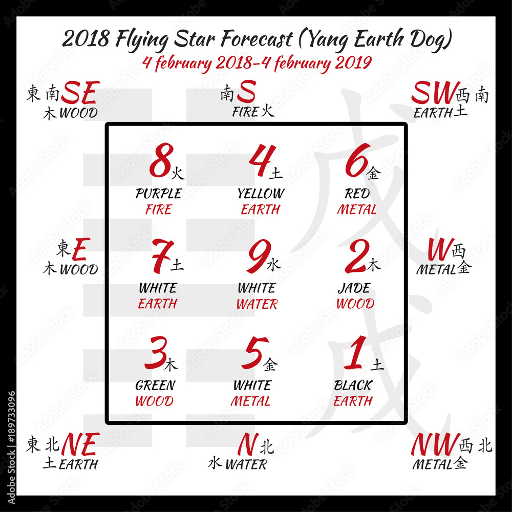 Flying Star Forecast 2018 Chinese Hieroglyphs Numbers Translation Of Characters Numbers Lo Shu Square 2018 Chinese Feng Shui Calendar 12 Months Yang Earth Dog Year Feng Shui Calendar By Months Stock Vector Adobe Stock